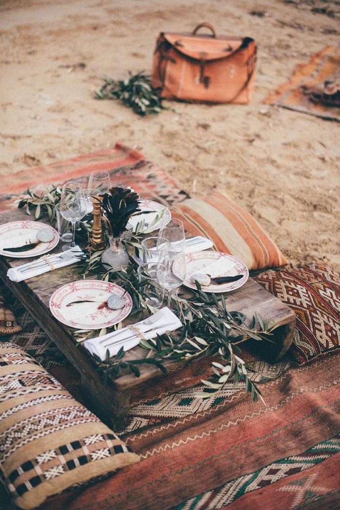 Los espíritus libres adoran el estilo bohemio, ¿verdad? Si es tu caso, prepara una mesa a orillas del mar con una alfombra y cojines y disfruta de la brisa.