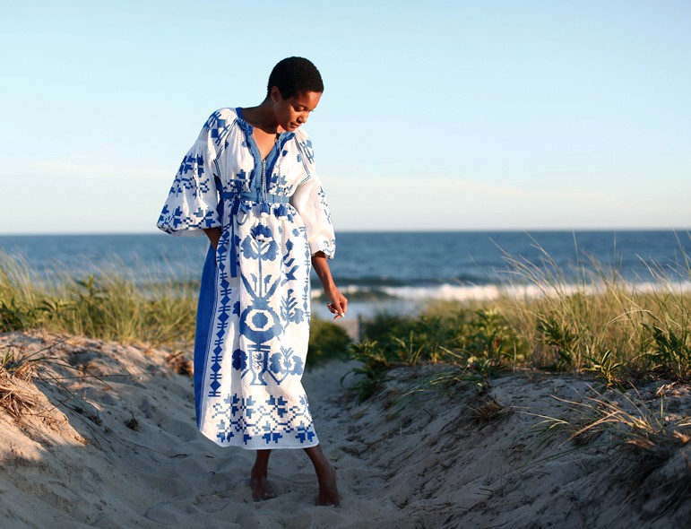 Túnicas estilizadas con bordados o estampados encima, este ejemplo es claro, sin embargo la recomendación sería buscar en tonos beige o arena, no blanco.