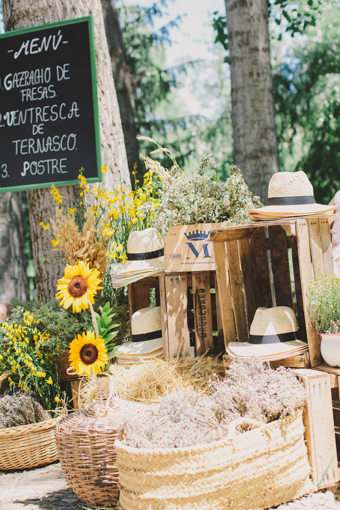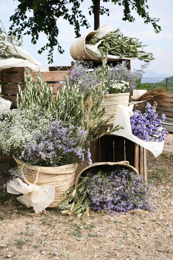 Llenar las cestas con flores silvestres y arómaticas como la lavanda o el romero y con hojas de olivo son ideales.