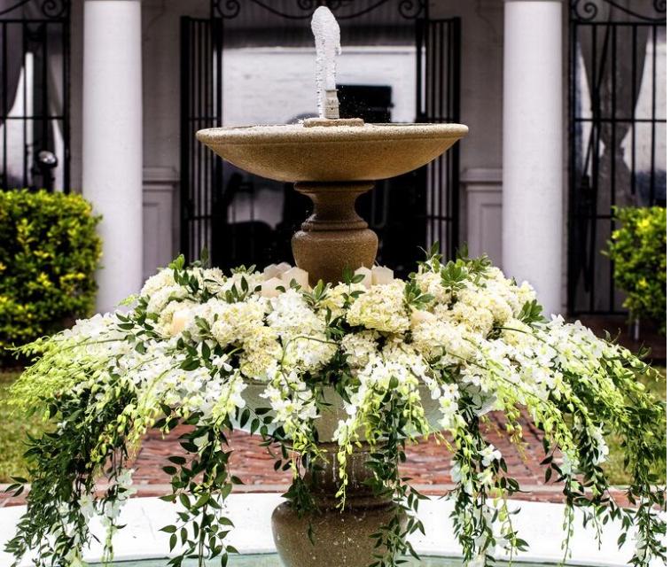 La vegetación en cascada y las exuberantes hortensias imitan una fuente romántica desbordante, pero con mucha más extravagancia.Lleva este look a un nivel completamente nuevo de romance agregando velas flotantes y nenúfares a la piscina.