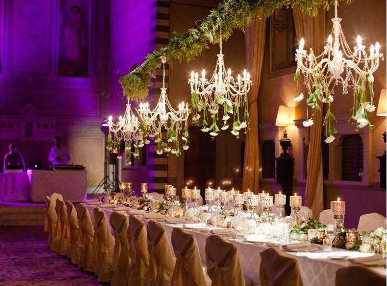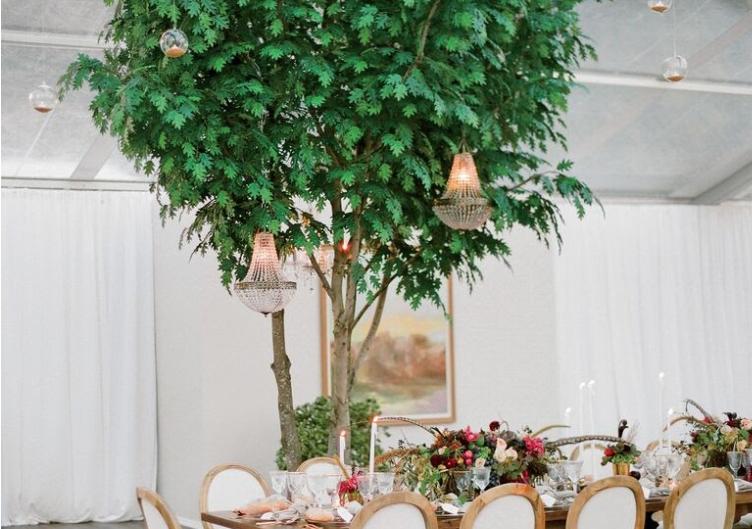 Nos encanta la idea de traer el aire libre, con algo más que flores. Los árboles verdes altos hacen que un salón de baile se sienta como una fiesta íntima en el jardín, y puedes usar las ramas para colgar algunas piezas más de decoración, como candelabros de cristal en miniatura o luces de cuerda.17. Centros de mesa tropicales