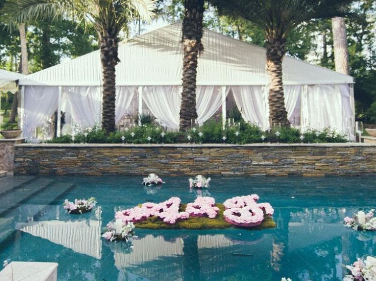Hemos visto monogramas florales antes, pero rara vez flotando sobre un lecho de musgo en un lujoso paisaje acuático, rodeado de islas de velas y arreglos florales.Si Tu lugar tiene una piscina o estanque ¡sé creativo con la decoración! Es una oportunidad para crear una estética asombrosa.