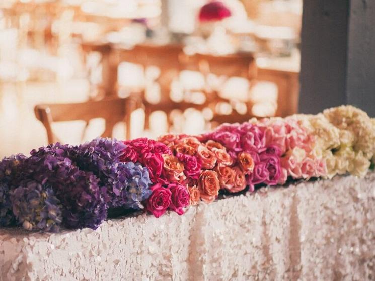Con un elegante corredor floral ombre, puedes tener una gran cantidad de colores sin que el arreglo parezca caótico. Complementa la mesa con un mantel neutro para que no haya demasiadas cosas; un material de lentejuelas mate o ropa de cama beige tienen texturas divertidas, pero no distraen.15. Corona de flores invertida