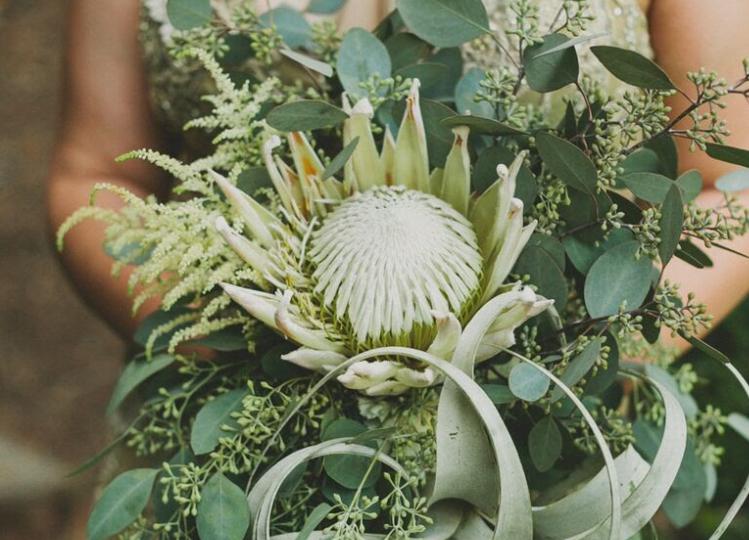 Para un arreglo de ramo nunca antes visto, este se lleva la palma. King protea es la atracción principal aquí, complementada por una impresionante planta aérea y un grupo completo de eucaliptos sembrados. Estoy segura de que muy pocas veces lo has visto, por eso somos lasbodasoriginales.com.Te dejo por aquí estas ideas de ramos de novia que te ayudará a elegir el apropiado.