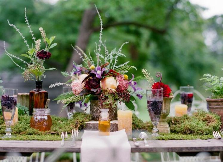 Con un tramo de musgo y algunos arreglos florales de aspecto salvaje, puedes crear una mesa llamativa al estilo del bosque.Organiza flores oscuras en tonos joya en urnas con patas y, para completar el look, agrega rellenos únicos como helechos violín y bayas de hipérico burdeos.