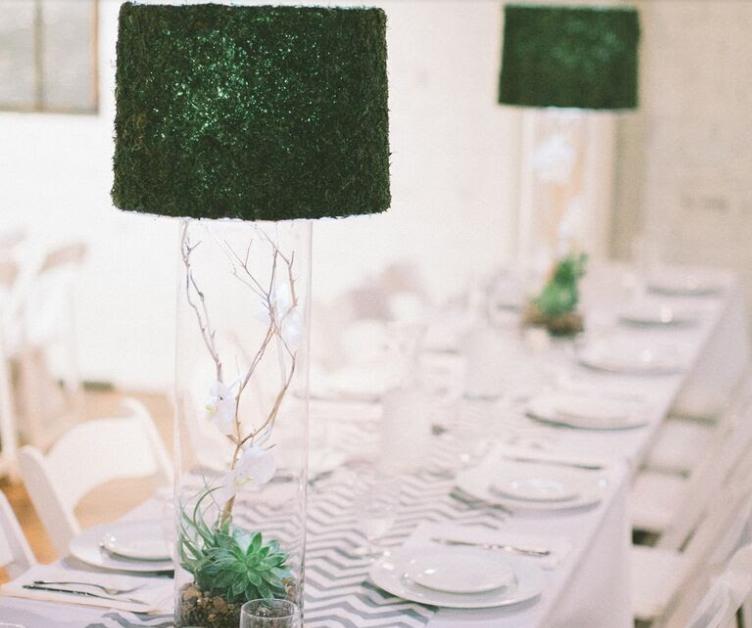 Dale un giro a tu suculento centro de mesa y haz que tu florista cubra un jarrón alto con una pantalla de lámpara, ¡hecha de musgo! Si no quieres sacrificar los centros de mesa florales, también puedes llenar el jarrón con flores o esparcir pequeños jarrones de capullos con un solo tallo (como rosas, tulipanes o dalias) para darle un toque floral que no se verá demasiado ecléctico.11. Candelabros florales
