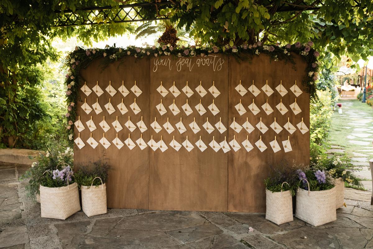 Durante el coctel los invitados se acercaron al seating plan que elegantemente fue preparado a mano para cada uno de los invitados, con el sello personalizado que continuaba con la misma línea de toda la gráfica de la boda.