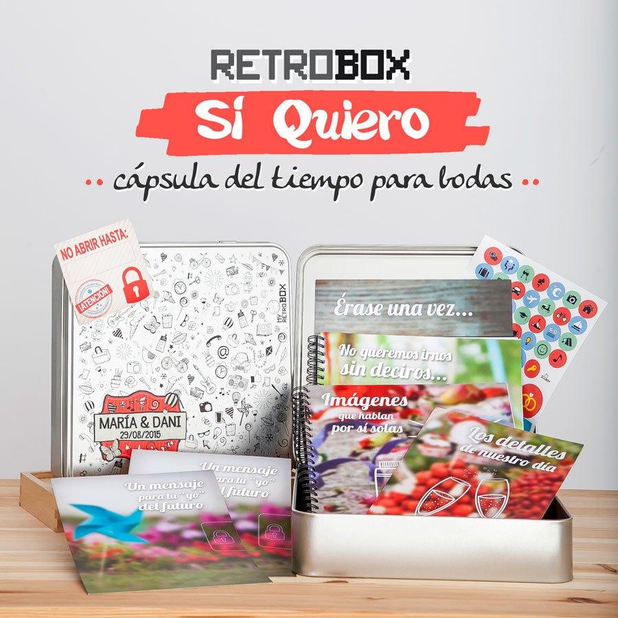 Una opcion genial, a la vez que tremendamente original. Cajitas personalizadas con el nombre de los novios donde ellos van a poder dejar todos los recuerdos de su dia. Con Album de fotos, libro de firmas, laminas para que los novios se escriban unas palabras el uno al otro y una mision muy especial, no abrir la cajita hasta la fecha indicada. Los creadores de estas geniales cajitas son Maria y Dani de My Retrobox.