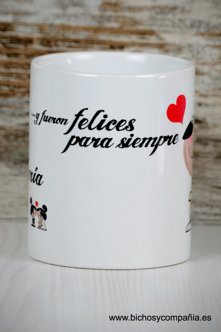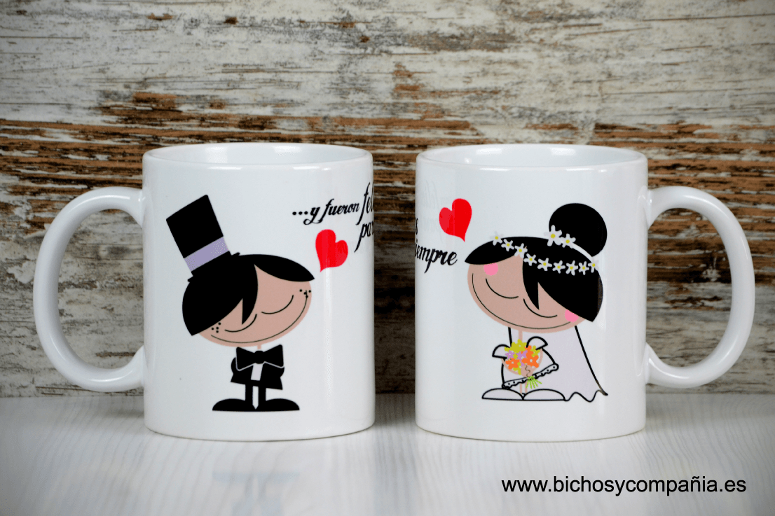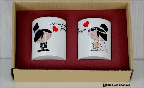 Si no os podéis permitir hacer un gasto muy grande en el regalo de boda, estas tazas pueden ser perfectas, con un mensaje perfecto para el día de la boda y para que cada mañana tengan un recuerdo vuestro, mientras toman el desayuno. Estas tan bonitas que os enseño en el post, las encontrareis en Bichos y Compañía.