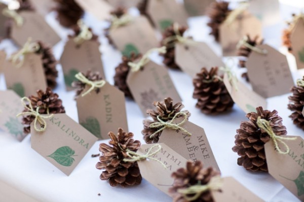 3. Seating formado por piñas, ¿qué os parece la idea de poner el nombre de los invitados en piñas? Podéis decorarlas con nieve o con purpurina, dándole un toque de color.