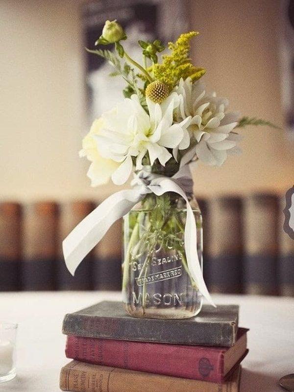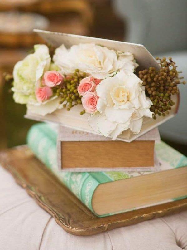 Hay muchas novias que desean agregar un estilo vintage a su boda, pero no se atreven o quieren que toda la decoración sea en ese estilo porque también gustan de lo actual, si este es tu caso te recomendamos darle el toque vintage a la recepción solo con los centros de mesa. Inspírate un poco, este espacio es especialmente para ti.Centro de mesa vintage: Libros y Flores