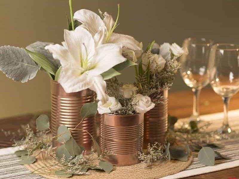Los centros de mesa sencillos para boda están en tendencia últimamente, para copiar este estilo sólo necesitas tres latas de cualquier alimento, sería perfecto si estos son de diferentes tamaños para hacer un juego visual muy atractivo. Puedes utilizar esta decoración en las bodas al aire libre, usualmente se combina con un juego de flores de paleta neutra, es decir, que reinan las escalas grises y el blanco con pequeños toques de verde.Fotografía: Novacom.top