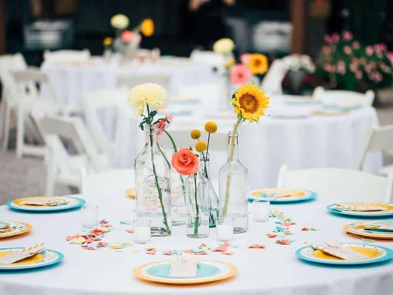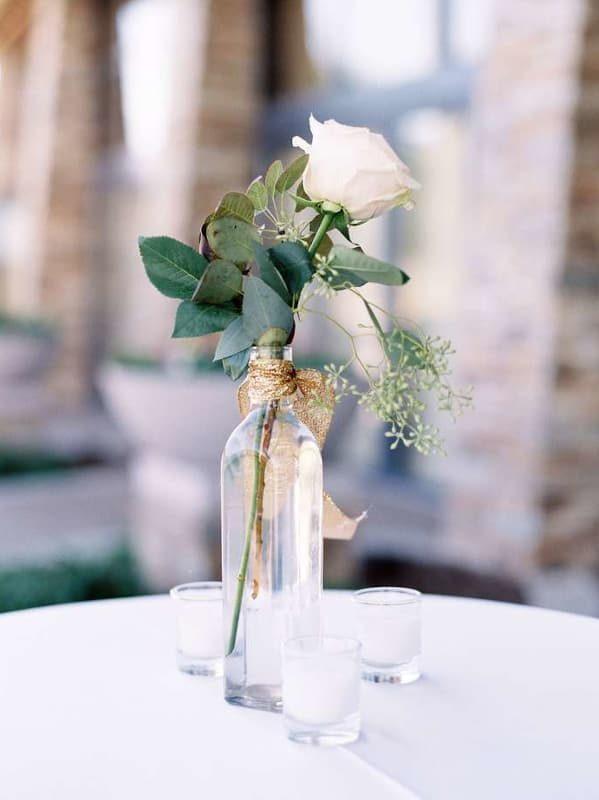 Si quieres un solo elemento como centro de mesa sencillo para tu boda puedes optar por una botella de tamaño mediano, las de aceite de oliva suelen funcionar muy bien por su forma definida y bordes suaves. Los mejores elementos de decoración son las cintas de colores, que deben hacer juego con la decoración de tu boda, la rosa en este ejemplo se puede observar de color blanco pero podemos sustituirlo por un color más vibrante que vaya acorde con la decoración general.Fotografía: Jimena Fernández