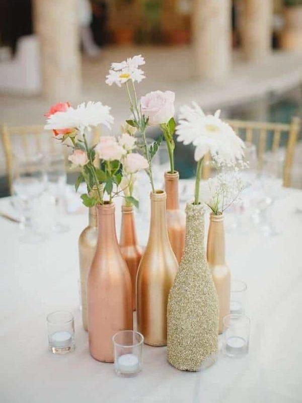 Si puedes encontrar muchas botellas de vino entonces podrás llevar a la realidad esta idea. No te compliques la vida, solo píntalas de varios colores que estén dentro de la paleta de color de tu decoración. En este ejemplo podemos observar que el color principal dorado, por eso se utilizaron flores neutras para equilibrarlo, las rosas en colores pasteles, blanco beige, hará la diferencia en tu decoración.Fotografía: Nova photography studio