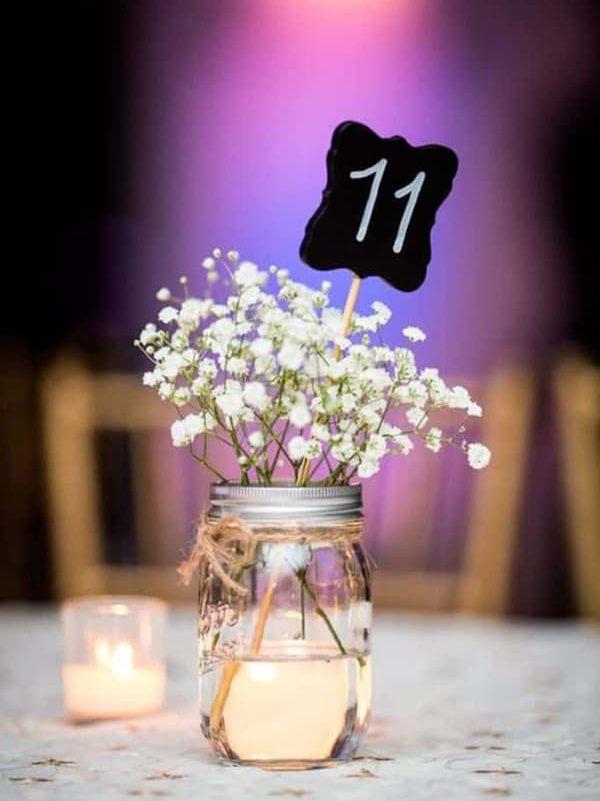 Entre tantos formatos para los centros de mesa de una boda, quizá este sea uno de los que más llame tu atención, ya que incorpora todos los elementos decorativos que se necesitan. Un frasco transparente lleno de agua va a marcar la diferencia, procura utilizar la tapa como base para las flores, recomendamos que sean de un tamaño no exajerado para resaltar las flores y el número de la mesa. También puedes añadir un pequeño detalle como una cinta de color como complemento.Fotografía: Luciasecasa.com