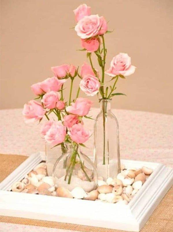 Las piedras, una base de madera, una botella y flores puede ser una gran combinación. La magia de esta decoración está centrada en el color de las flores, busca centrarte en un color intenso y vivo que atrape la atención, solo para que sutilmente la mirada se desvíe hacia el frasco qué deslumbrará la imaginación de muchos. Cabe destacar que las rosas pueden ir tanto dentro como fuera del frasco y se verán igual de bien.Fotografía: Luciasecasa.com