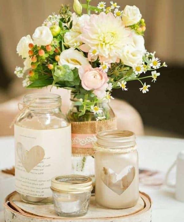 Como hemos venido la creatividad no tiene límites, y cuando se trata de centros de mesas eres tú quien puede limitarse. Este juego de envases es uno de los más populares y te lo recomendamos con los ojos cerrados, simplemente toma frascos de diferentes tamaños y agrega texturas como papel, tela, malla, entre otros. Asimismo, asegúrate que las flores sean llamativas y muy grandes, hay una combinación de colores entre saturados y neutrales, sólo así se mantendrá la armonía y combinará perfectamente con toda tu decoración de boda.Fotografía: cafeversatil.com