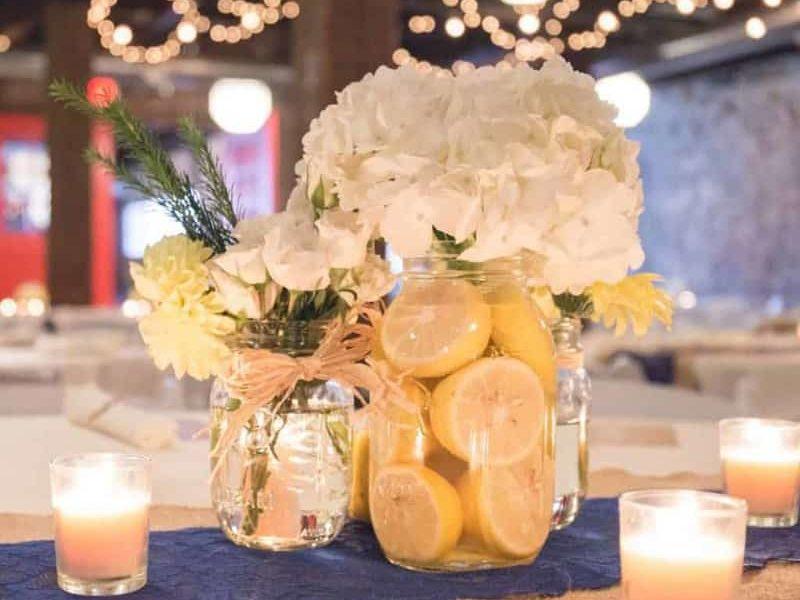 Muchas veces la decoración no solo es importante visualmente, a veces los olores juegan un papel fundamental. Entre los centros de mesa sencillos que puedes replicar te recomendamos las combinaciones entre frutas y lazos. Puedes tomar uno o varios recipientes y llenarlos con agua, agregar rodajas de limón o naranja de esta forma todos en la mesa podrán percibir su sutil y fresco aroma, juegan un papel fundamental porque son coloridas y resaltarán tanto que tus invitados te lo agradecerán.Fotografía: Laura Goméz