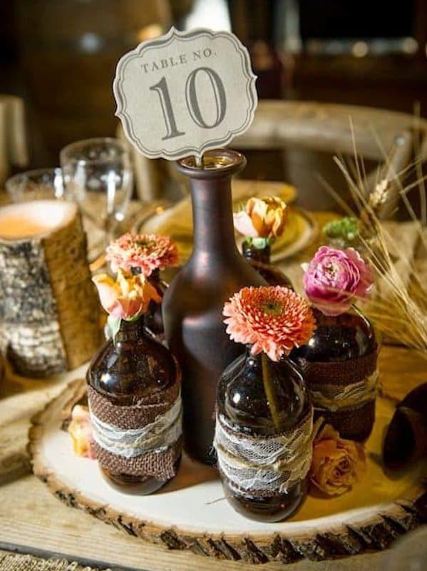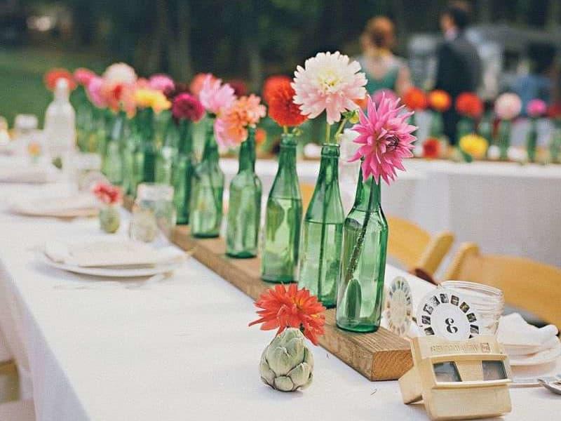Si puedes encontrar muchas botellas de un mismo color, esta idea de decoración es para ti. Quizás puede parecerte poco original, pero un ejercito de botellas unicolor con flores diversas le dará a tu boda un ambiente primaveral y divertido.Esta idea va bien si las mesas son separadas o juntas de gran longitud. Lo ideal es que coloques las botellas en una sola línea, los diferentes tonos harán interesante la línea por lo que todos se sentirán atraídos de ver la decoración, en la base puedes utilizar madera para separar las botellas de la mesa y darles así mucho más protagonismo.