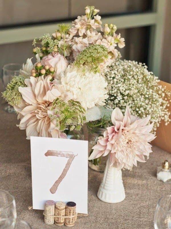 No siempre el soporte en el centro de mesa tiene que ser el centro de atención, presta atención al detalle floral utilizado en esta idea. Una paleta de color pálido, unas flores que parecen muy antiguas y un soporte tan diminuto que parece imperceptible pero juega un papel importante. No dejes de nota los corchos y el marcador del número de la mesa, todo da una impresión vintage sin utilizar elementos verdaderamente retro.Fotografía: Cecilia Rosso