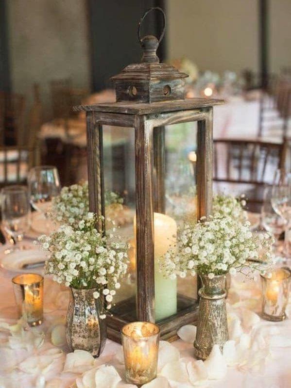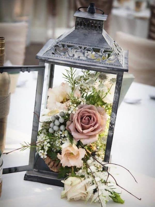 Otro elemento común en las bodas con estilo vintage son las lámparas jaula o lámparas de jardín, aquellas de vidrio que tienen esa hermosa puertecilla, todavía hoy en día se fabrican copias para revivir ese hermoso diseño. Debes asegurarte que el arreglo floral interior sea lo suficientemente abundante para que lo llene de vistosidad.Fotografía: beatifulbluerides.com