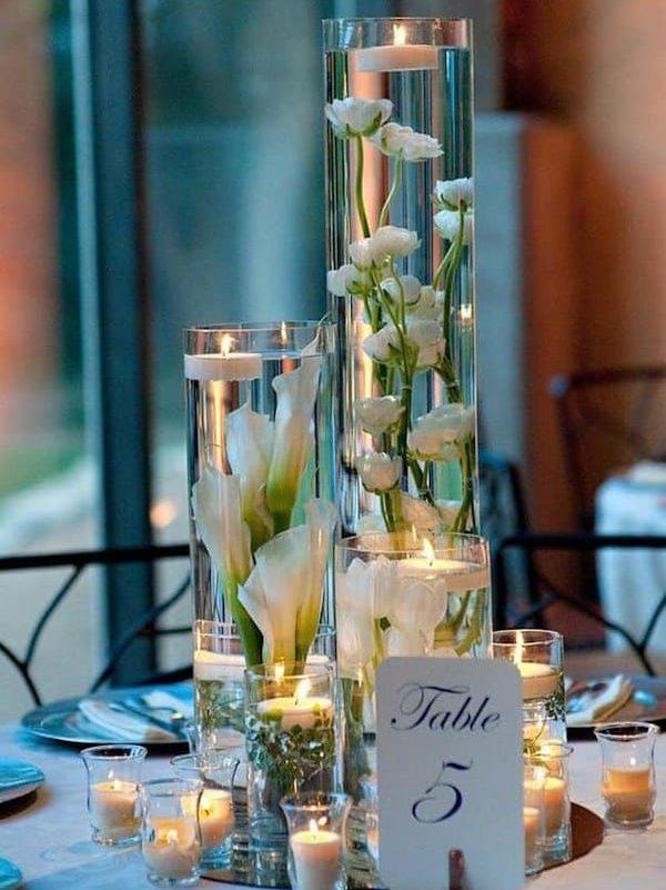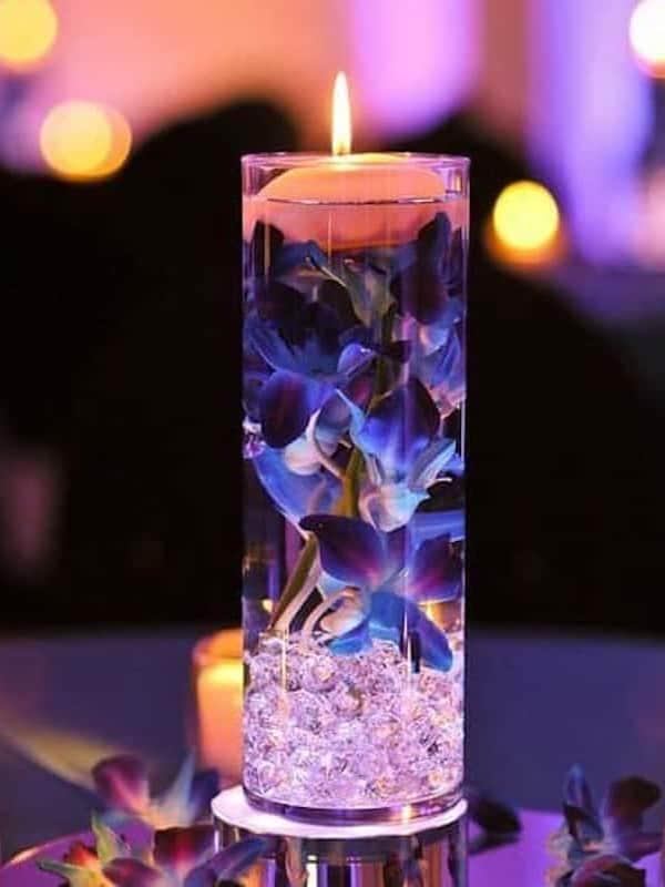 ¿Quieres representar el romanticismo de una noche a la luz de las velas? Con este centro de mesa elegante podrás lograrlo con seguridad. Coloca algunas flores acuáticas sumergidas en agua con piedras de cristales y una diminuta vela que sobresalga en el tope. Los colores de las flores deben armonizar con la decoración general del salón.Fotografía: Centrosdemesa20.com