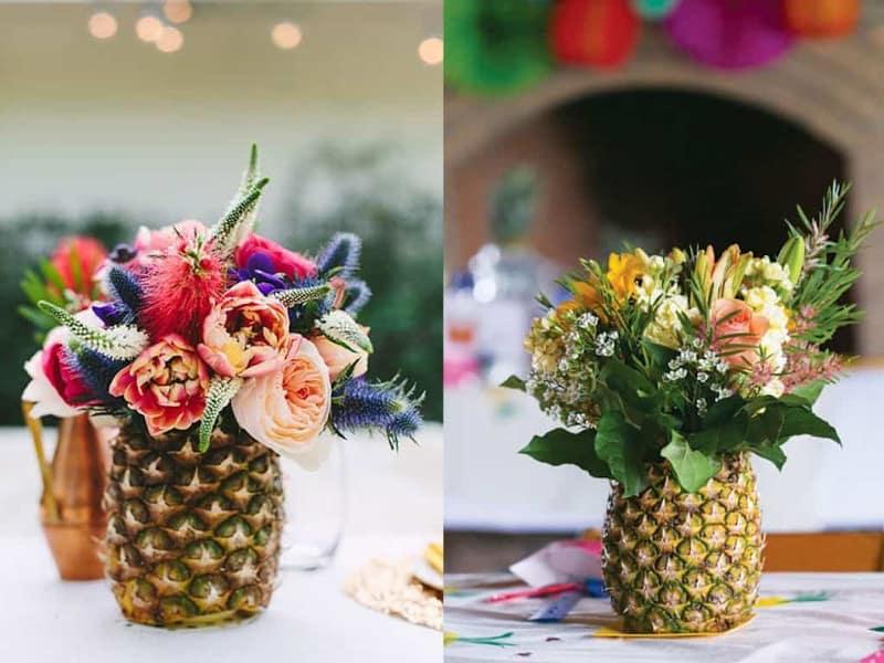 El dulce olor de una piña recién cortada es muy agradable al olfato, es una explosión a los sentidos del olfato y ofalto. Compleméntalo con un ramo de flores coloridas, además de ser atractivo a la vista es muy creativo, te aseguro que no muchos tendrán estos centros de mesas en su boda.Fotografía: Nova Studio