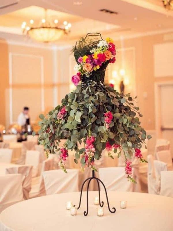 ¿Para qué llevar un vestido de flores cuando puedes hacer un centro de mesa con forma de uno? Sólo necesitas un modelo donde colgar las flores y darle esa atractiva forma de vestido. Si quieres sorprender realmente a todos tus visitantes puedes ir por esta opción, no creo que lo hayan visto jamás.Fotografía: Shanks Studio