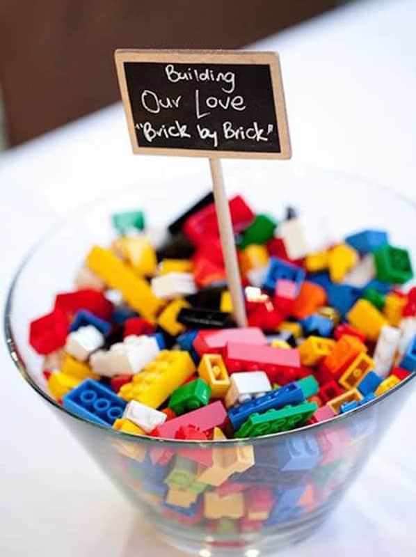 La originalidad de este centro de mesa radica en la creatividad de expresión a través de los elementos. Utilizando bloques de construcción de juguete que indican la forma en que verdaderamente se construye el amor de pareja.Fotografía: Fernando Paz