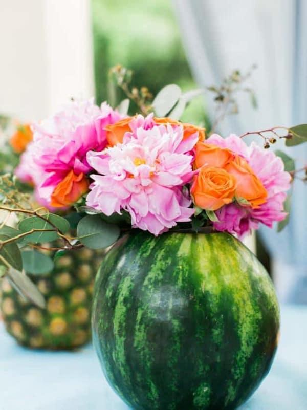 Los olores frutales siempre son bienvenidos en cualquier situación, por alguna razón química que no viene al caso, el olor de las frutas da placer y transmite alegría. Cuando las bodas se celebran al aire libre este tipo de centros de mesa resulta especial, nada más original que combinar un ramo de flores coloridas que utilicen como soporte base una jugosa y olorosa fruta.Fotografía: Sweets photo studio