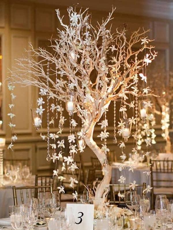 Como último centro de mesa original, te proponemos un pequeño árbol en la mesa con una decoración en forma de lluvia, sería genial utilizar flores y brillantes colgando de sus ramas, todo ello le da un toque de ensueño.Fotografía: Natura Estudios
