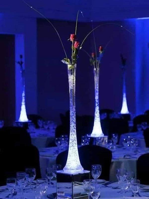 Este centro de mesa demuestra que con algo de creatividad puedes maravillar todo un escenario. Es un poco más alto de lo usual, la forma va perdiendo grosor mientras se eleva bajo un fondo iluminado con un par de rosas en el tope, realmente es digno de admirar en cualquier boda.Fotografía: Pinterest.com