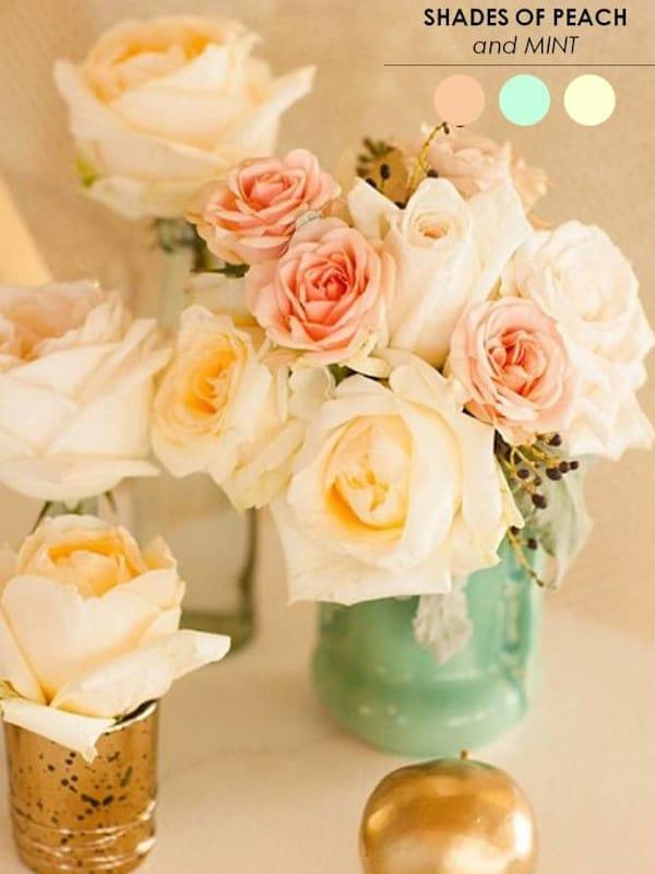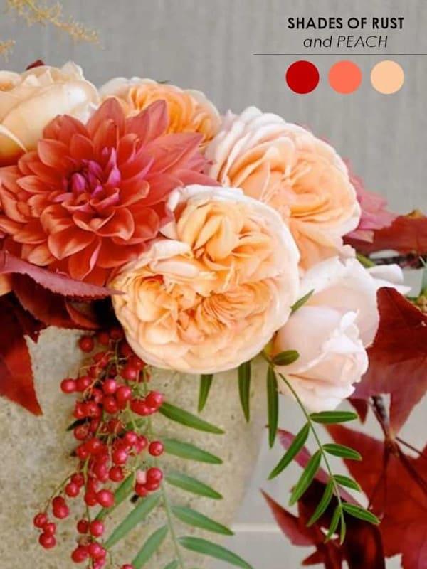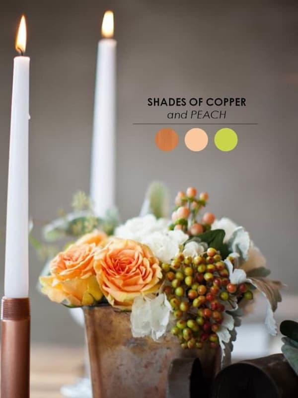 Antes de comenzar, debes saber que la combinación de flores para un centro de mesa es muy amplia, por lo tanto, trataremos de enseñarte las paletas de colores más actuales para que puedas defir mejor qué tipo y color de flores deseas utilizar en la decoración de tu boda.Centro de mesa floral: Tonos cobre y melocotón