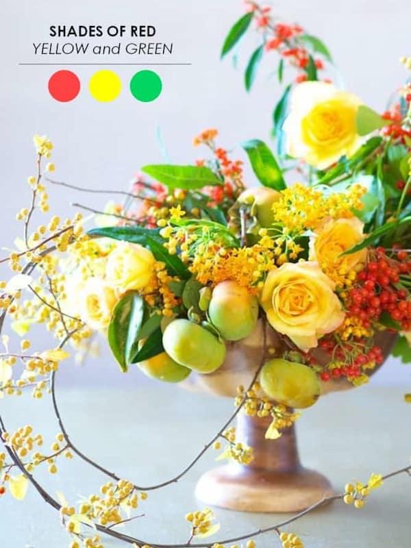 Centro de mesa floral: Tonos rojo, amarillo y verde