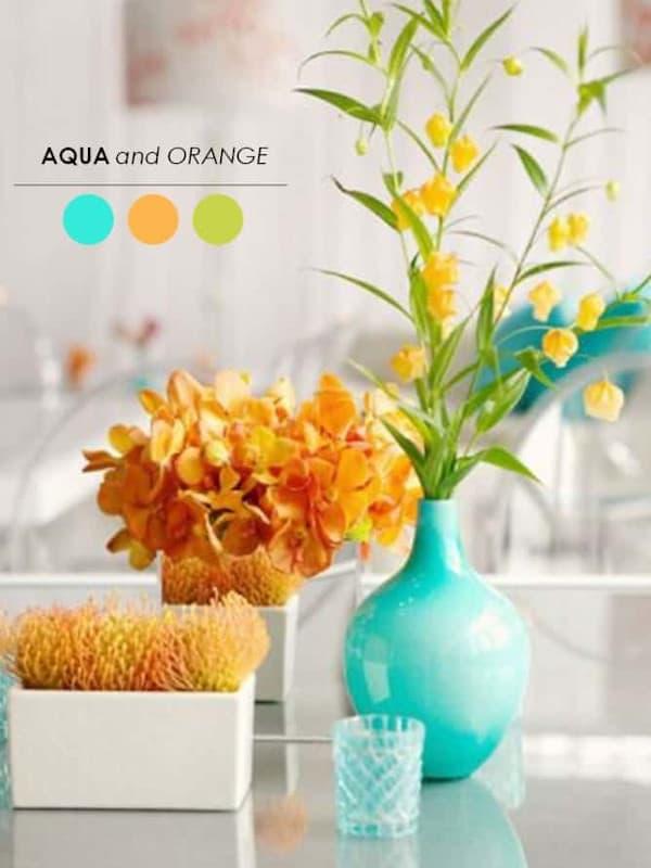 Porque te agraden los colores pasteles no significa que la estética de la decoración de tu boda será vintage, pero si lo deseas así te recomendamos una paleta de color basada en el turquesa, naranja y verde lima.Sería ideal que las flores tengan una textura rústica, ya que el toque de delicadeza estará enfocado en el centro de mesa usualmente fabricado en cerámica en este caso de color turquesa para el contraste. Por otra parte, el arreglo floral debe ser verde y los pequeños detalles amarillos que transicionen perfectamente sin interrumpir la armonía.