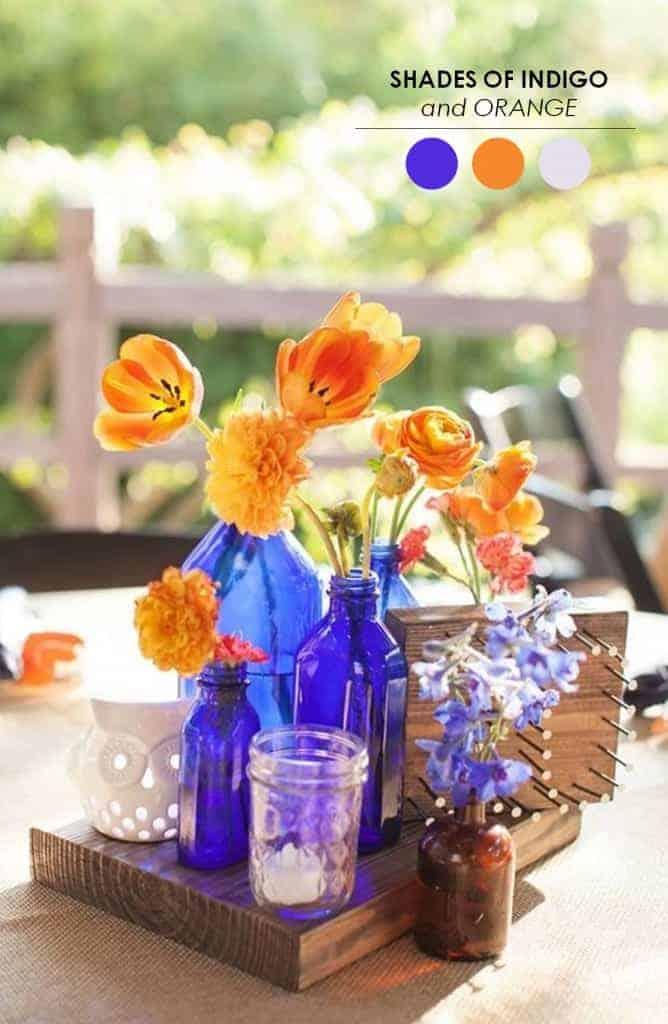 Cuando queremos realizar una boda con un estilo campestre no hay mejor decoración y combinación de colores que la paleta índigo, naranja y blanco. Además que los toques naturales y vibrantes fortalecen la armonía cuando estamos al aire libre.Te recomendamos especialmente que los centros de mesas sean índigo si es posible en cristal pero que sea un poco traslúcido, por otra parte, detalles en madera rústica sería un elemento muy digno de apreciar. Por último que las flores sean una perfecta mezcla entre naranja y blanco.