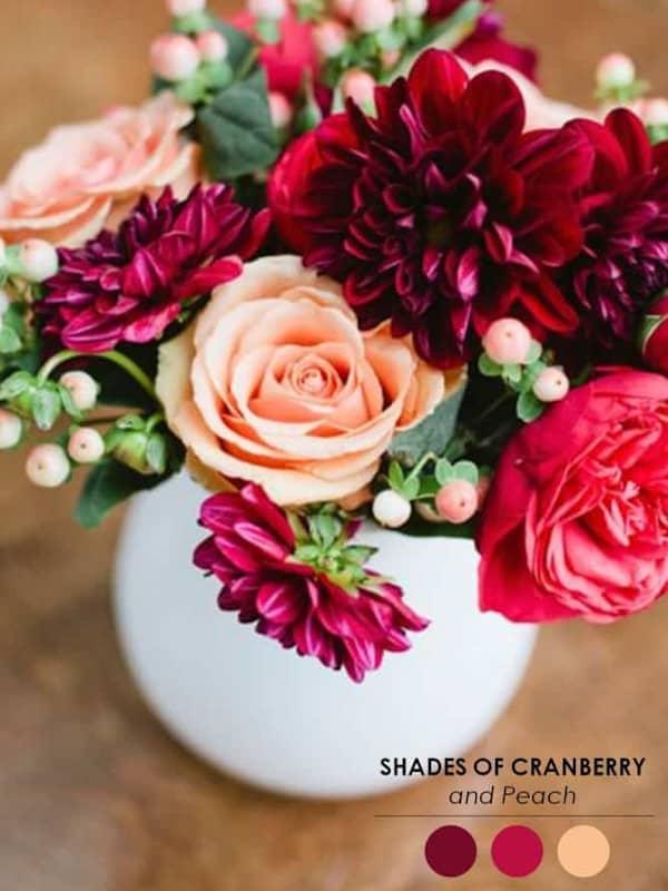 El vinotinto siempre se ha relacionado con el amor, con una intensidad mucho más fuerte de lo cotidiano, además de ser elegante. Si buscas que tu boda sea exclusiva, puede que quieras realizar tu decoración con una paleta de color entre arándano rojo o vinotinto, verde, coral y naranja pastel.El centro de mesa se apreciaría mejor en color blanco, usualmente hará juego con las paredes del salón, además los colores verdes transicionan mucho mejor que aquellos colores más saturados como el vinotinto.