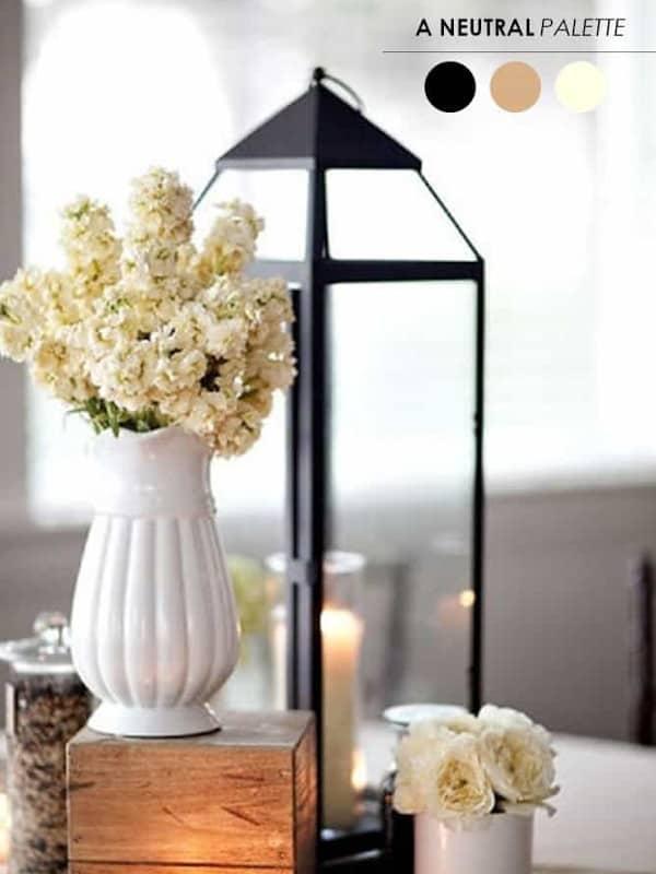 Cuando eres amante de las paletas de colores neutrales y de las bodas clásicas puede que estos centros de mesa florales sean tu mejor opción. Basado en el color beige, negro y blanco podemos optar por una decoración muy poco utilizada pero igual de hermosa y elegante.Utiliza el centro de mesa en porcelana de color blanco con candelabros de color negro y algunos detalles rústicos en color madera. En el caso de las flores podemos utilizar tonos más cálidos derivados del blanco como el marfil.