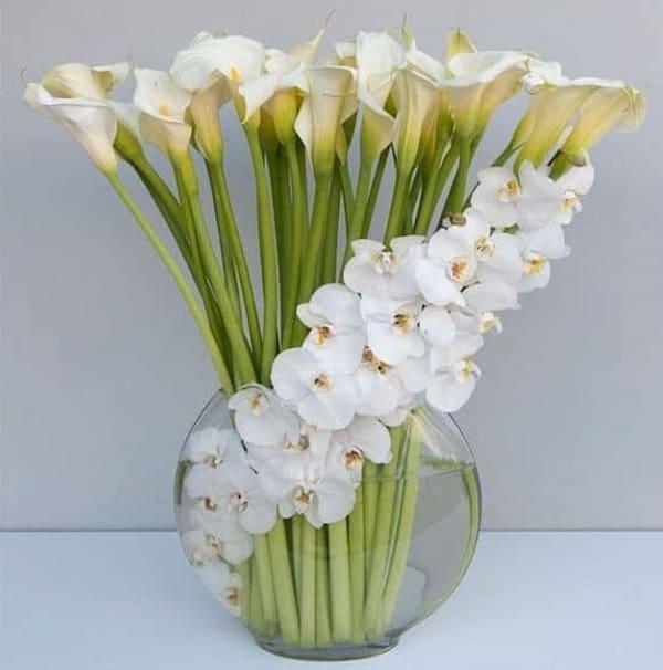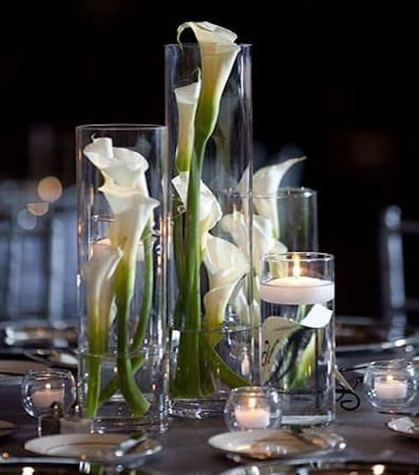 Una de las mejores formas para conseguir un centro de mesa elegante, es jugar con las formas y las texturas. En este caso se ha utilizado como base un recipiente circular, donde la altura y textura rústica y natural de las calas blancas logran una simetría muy interesante.Fotografía: COCO Photo Studios