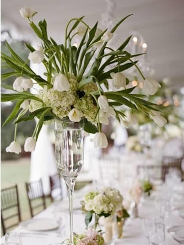 Otro gran diseño para exteriores, un centro de mesa elegante donde sólo necesitas una copa y un arreglo floral muy abundante, en especial cuando los tonos están sentados en el blanco.Fotografía: Decofilia.com