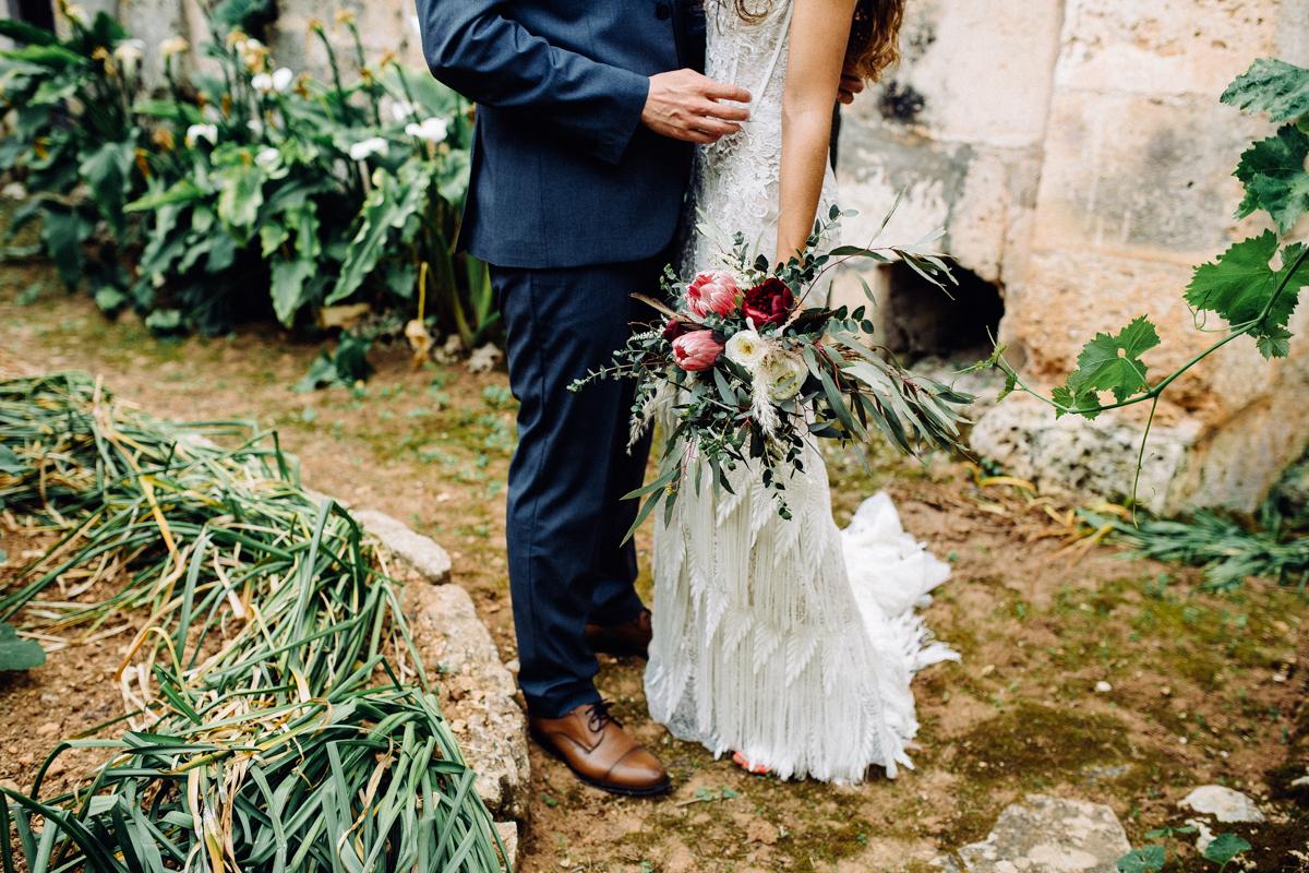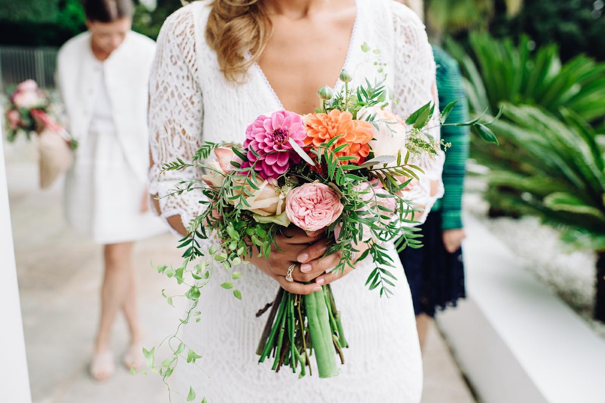 Elige tu ramo en función de tu vestido y tu morfología. Si eres bajita huye de los ramos en cascada que te harán más pequeña visualmente. Si tienes curvas puedes permitirte un ramo un poco más voluminoso. Y una regla de oro: cuanto más trabajado sea nuestro vestido: pedrería, bordados, incrustaciones, etc…más simple deberá ser el ramo.