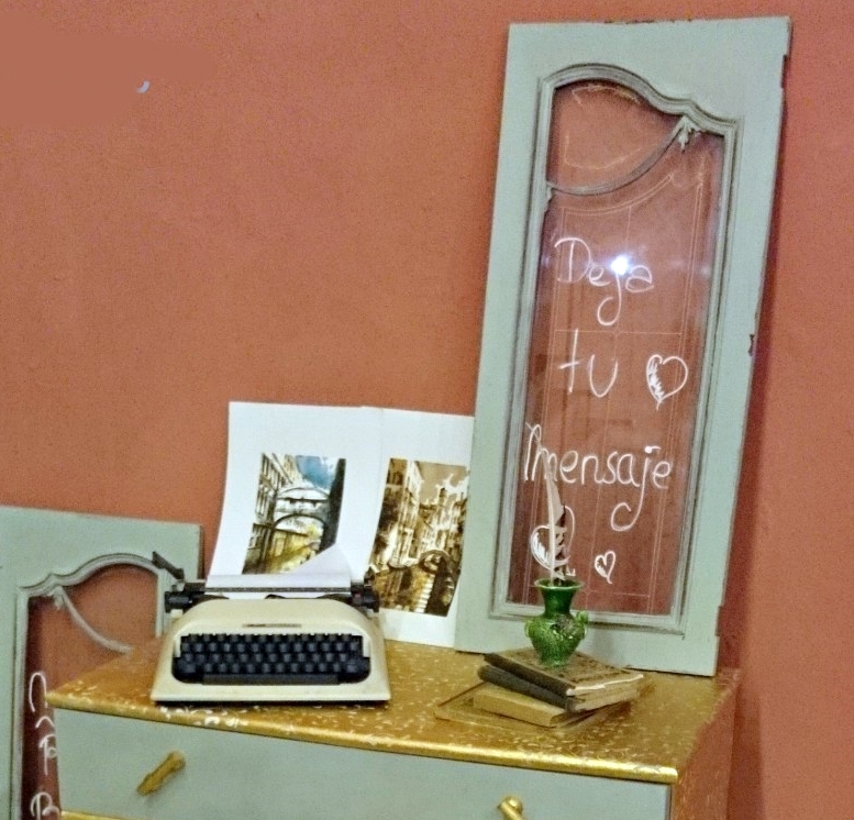 Aquí por ejemplo hcimos un cartel reiclando un marco vintage de una cómoda al que le faltaba el espejo.Sobre la trasera decoramos con pintura acrílica un motivo floral y un lema de bienvenda.