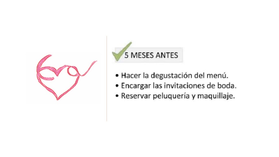 Ya va tomando forma, pero aún quedan muchas cosas por hacer. Por ahora, vamos con calma, tenemos tiempo por delante; aún así, es buen momento para buscar el vestido de tus sueños, el que te haga sentir radiante y única; iniciar tratamientos de belleza, elegir profesionales de estética y peluquería, decidirte sobre el viaje de novios, preparar invitaciones y papelería de la boda...
