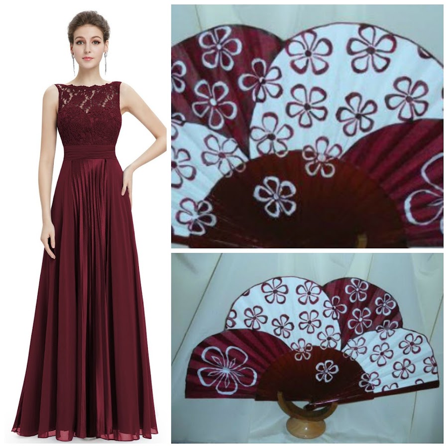 Empiezo con este vestido en color Burdeos i un abanico en la misma tonalidad y que siguiendo con los recortados le he hecho un diseño floral con tonos blancos y el propio burdeos.