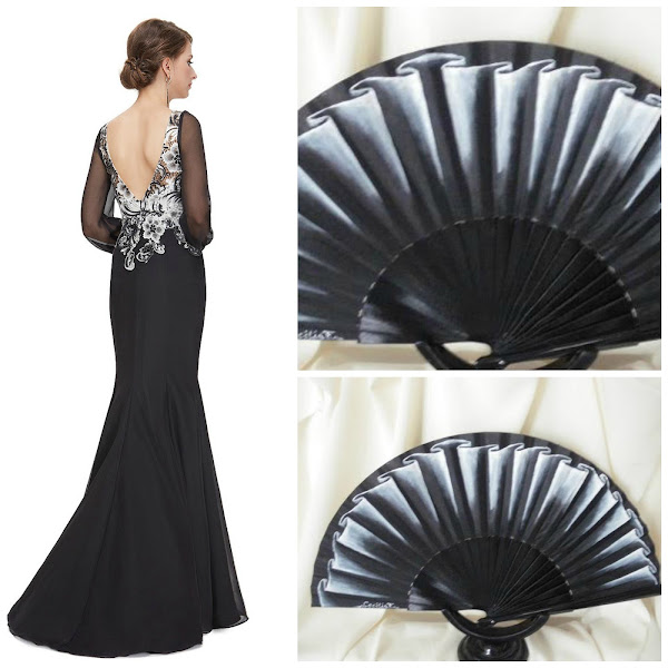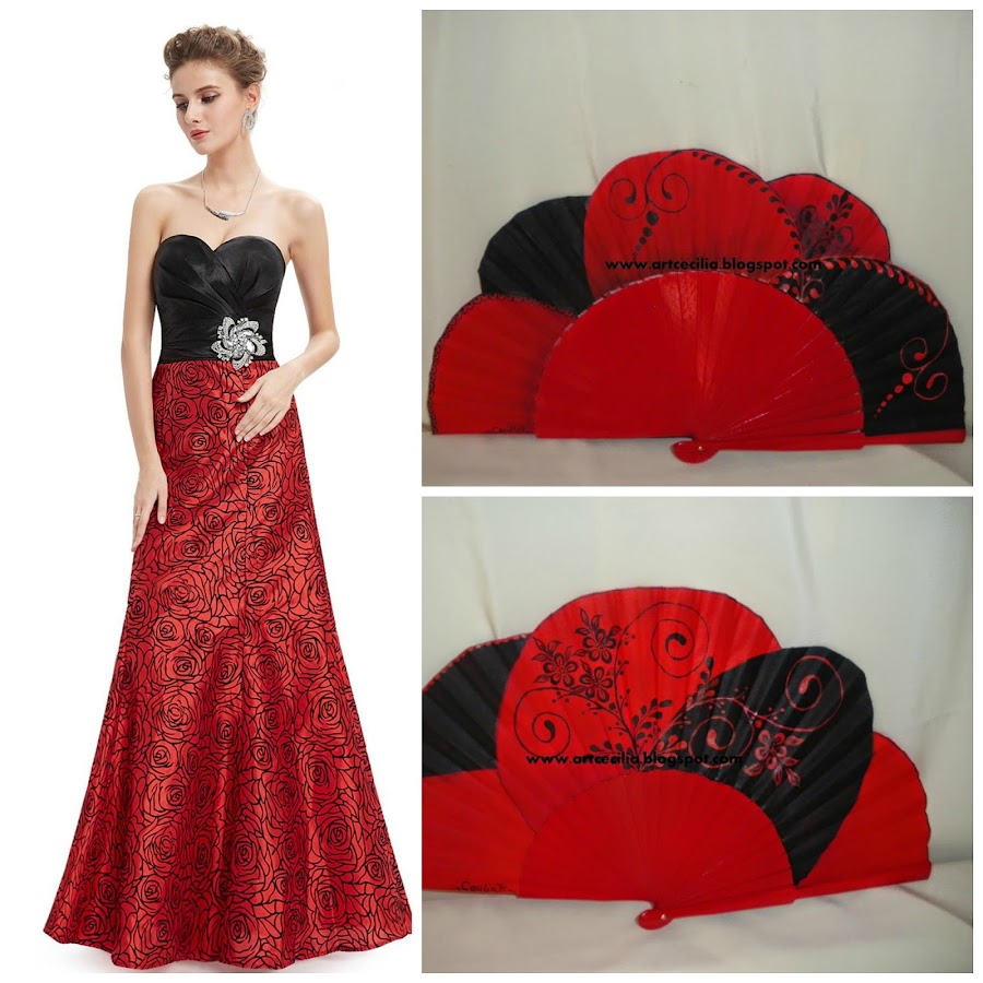 Ahora me decido por el rojo y negro que como sabéis es de mis favoritos y para este conjunto de vestido con cuerpo palabra de honor os presento dos abanicos también recortados y con distintos dibujos