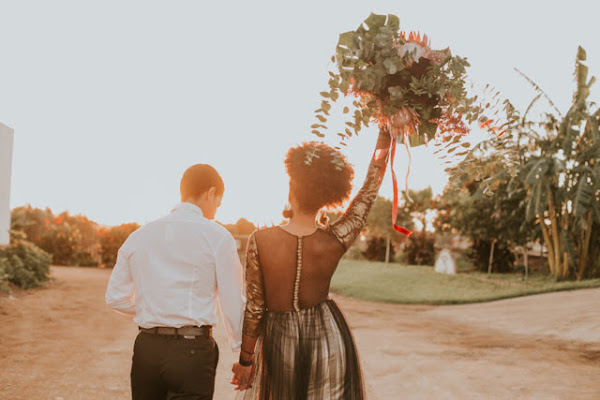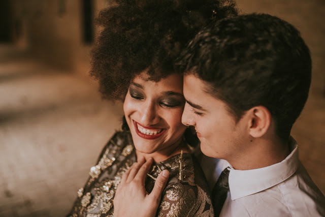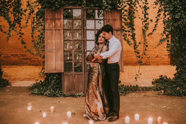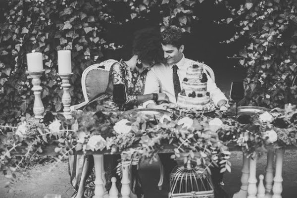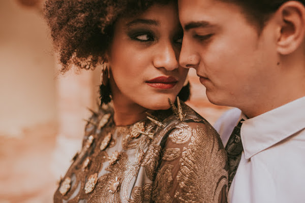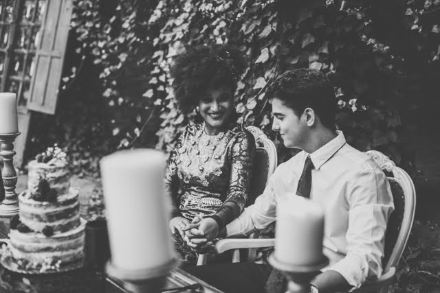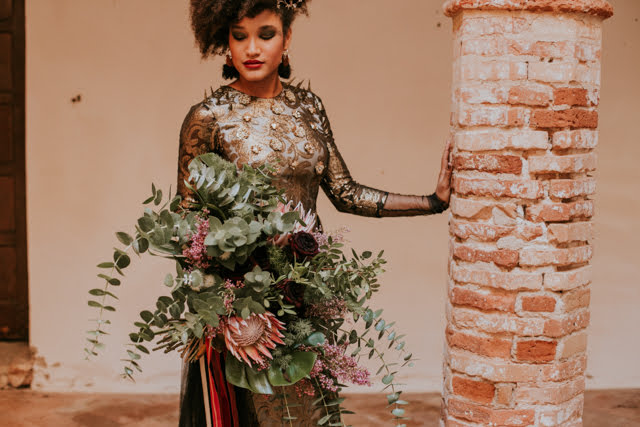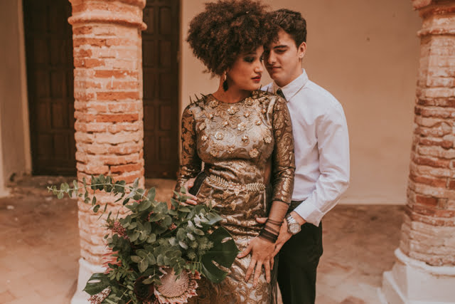 Unos novios llenos de personalidad, con un look rompedor. La novia, la gran protagonista, luce un vestido negro y dorado de estilo barroco.