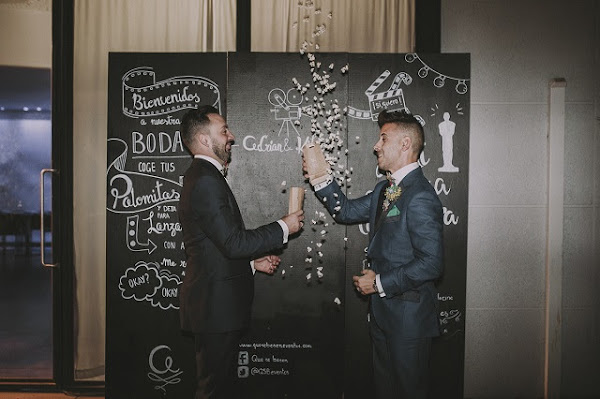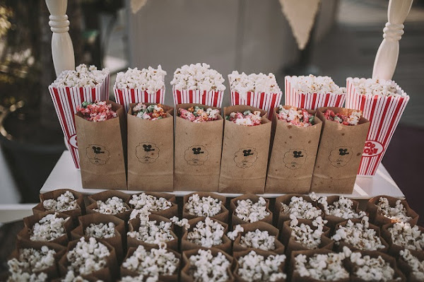 Una boda en la que no falto detalle, donde el tema era el cine, y las palomitas no podían faltar a la fiesta, dando la bienvenida a los invitados con cartucho de las mismas incluido, como buenos espectadores de cine, que llegaban a la vivir la película romántica más real.