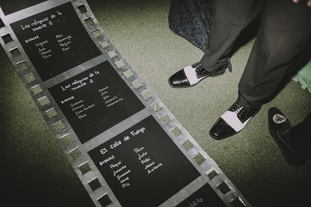 Una boda en tonos predominantes en negro y plata, con un seating plan que era un carrete de película XXL espectacular, hecho a mano por el padre de Adrián.