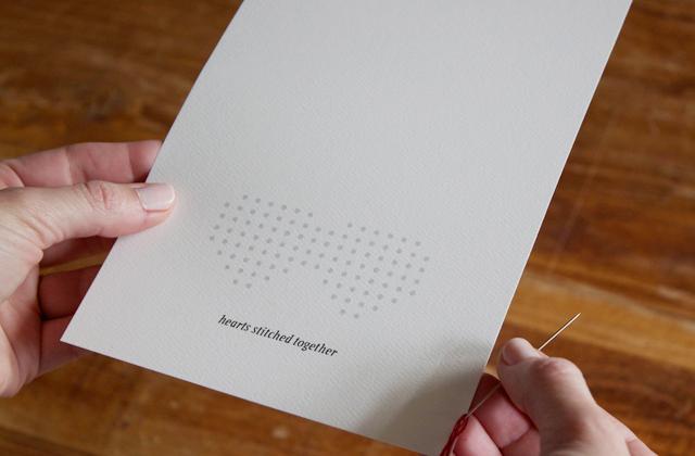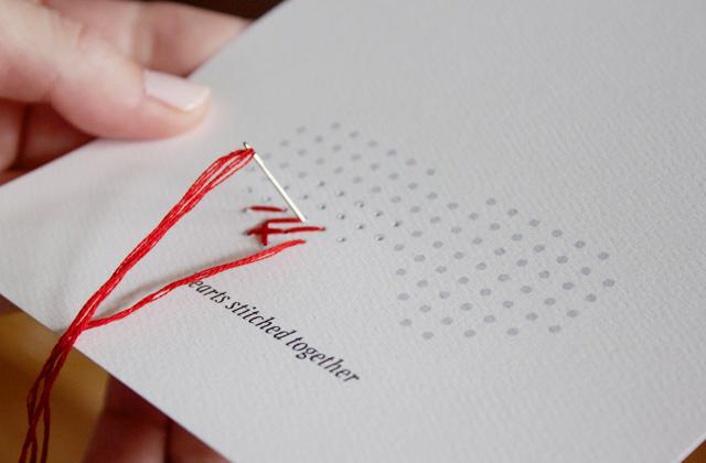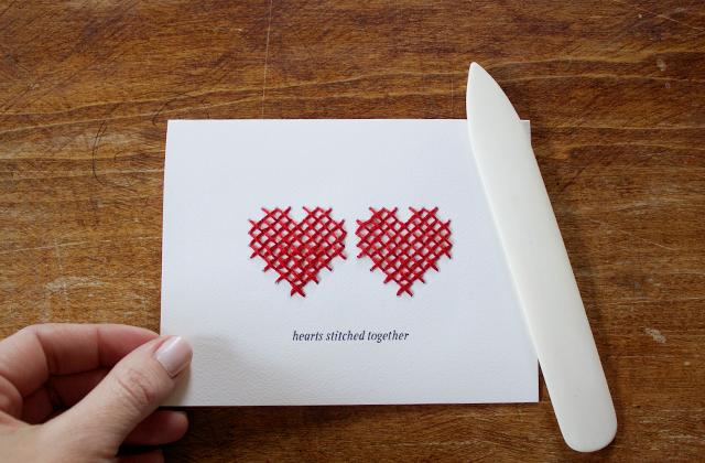 5. Una vez finalizado el bordado, plegamos la tarjeta. Para que el pliegue quede limpio y uniforme, podéis usar una plegadera como la que se ve en la imagen de abajo, o en su defecto, el mando de goma de la tijera, con cuidado de que no manche el papel.