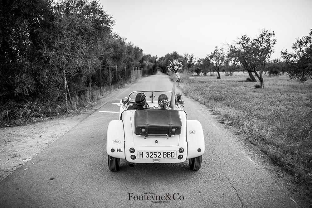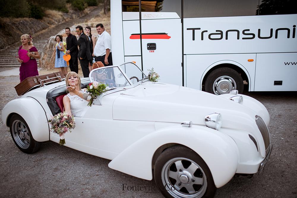 Los novios hicieron el pasillo de recién casados bajo una lluvia de pompas de jabón para embarcarse juntos en el primer viaje en automóvil a bordo de un flamante coche descapotable blanco.